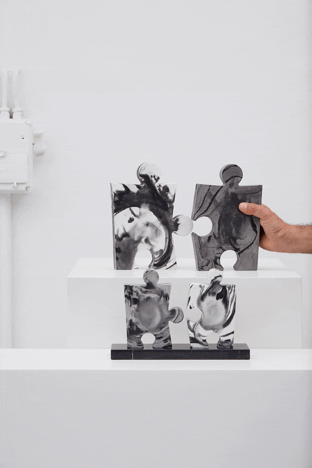 An industrial object, a toy of everyday use focusing on two forms that look like human figures. The sculpture symbolizes companionship and unification.